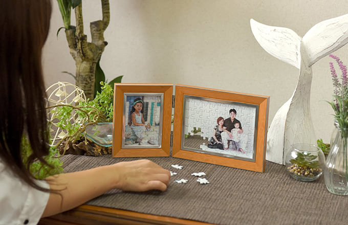 思い出のデートの写真をパズルにしてサプライズで渡しました。彼女はとても喜んでくれて、部屋にインテリアとして、パズルを大切に飾っています。