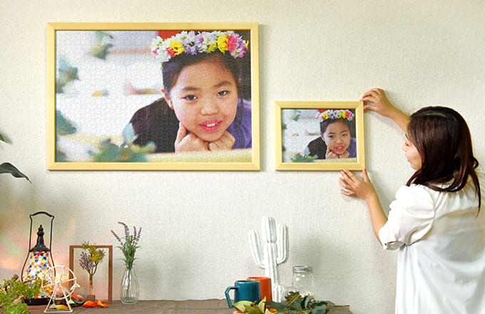 思い出のデートの写真をパズルにしてサプライズで渡しました。彼女はとても喜んでくれて、部屋にインテリアとして、パズルを大切に飾っています。